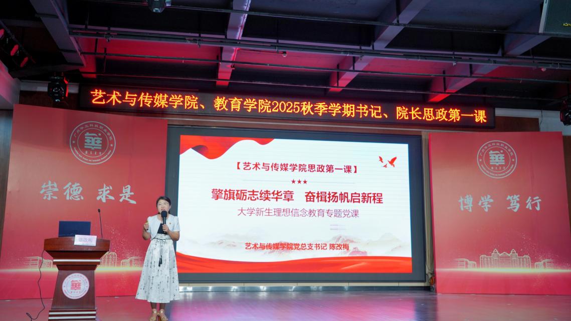 為引導(dǎo)和幫助青年學(xué)子學(xué)會(huì)用習(xí)近平新時(shí)代中國(guó)特色社會(huì)主義思想的先進(jìn)理論武裝頭腦,將個(gè)人成長(zhǎng)與民族復(fù)興緊密相連,扣好人生“第一粒扣子”,9月11日晚,藝術(shù)與傳媒學(xué)院黨總支書記陳改梅老師以 “擎旗礪志續(xù)華章 奮楫揚(yáng)帆啟新程”為主題,在圖書館八樓報(bào)告廳,為藝術(shù)與傳媒學(xué)院、教育學(xué)院新生帶來了情感觸動(dòng)強(qiáng)烈、思想啟迪深刻的“思政第一課”。學(xué)院院長(zhǎng)朱君、教師黨員和2025級(jí)新生參加聽課。