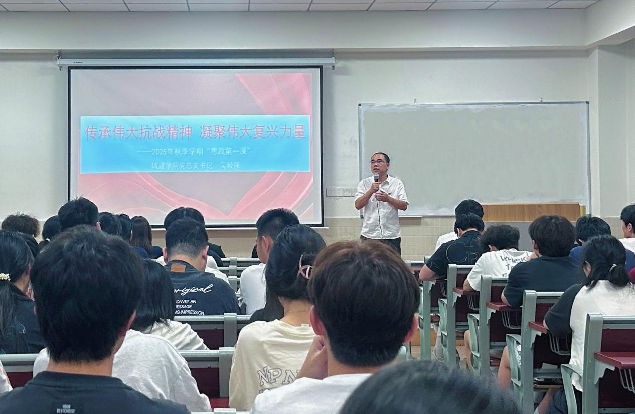 2025年10月14日,城建學(xué)院黨總支書記吳毅強(qiáng)在第二教學(xué)樓408教室,為24級、25級各專業(yè)學(xué)生代表講授主題為“傳承偉大抗戰(zhàn)精神 凝聚偉大復(fù)興力量”的“思政第一課”,引導(dǎo)青年學(xué)子從抗戰(zhàn)歷史中汲取精神力量,錨定民族復(fù)興使命。