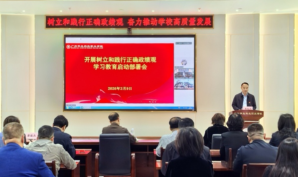 2026年3月9日下午,學校開展樹立和踐行正確政績觀學習教育動員部署會議在圖書館104會議室召開。學校全體校領導、各職能部門負責人、各二級學院黨組織書記和院長參加會議。云浮校區(qū)相關領導以視頻會議形式參加。會議由廣州華立科技職業(yè)學院校長、校黨委副書記廖俊杰主持,學校黨委書記陳良聲作了題為《自覺樹立和踐行正確政績觀 奮力推動學校高質量發(fā)展》的動員講話。