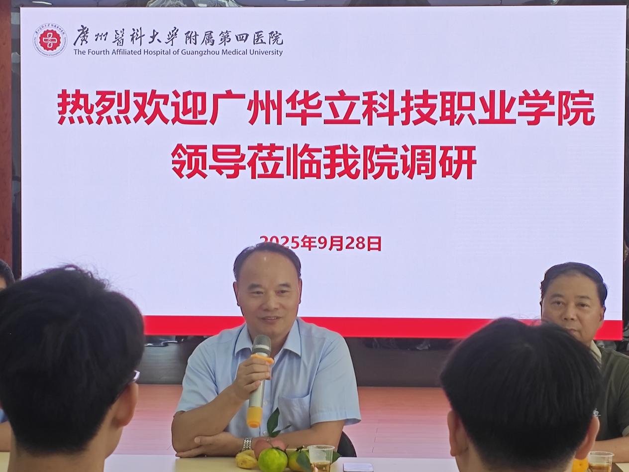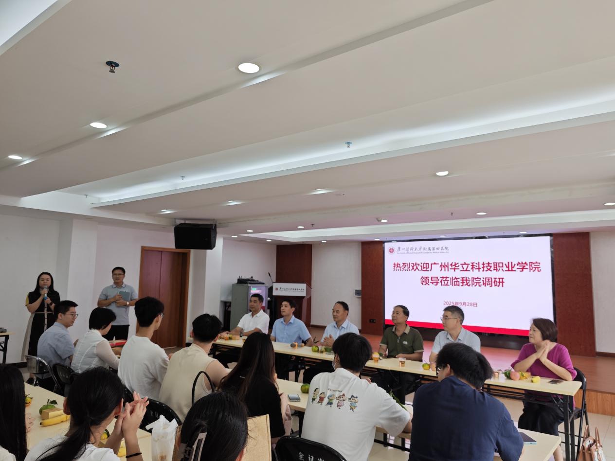 在國慶、中秋雙節(jié)來臨之際,2025年9月28日下午,我校廖俊杰校長、教務(wù)處孫麗英處長、實踐教學科韋建林科長、健康學院雷毅雄院長、李國良副院長、行政主任梁瑞云、實習指導老師鄧香華、楊鵬一行赴廣州醫(yī)科大學附屬第四醫(yī)院訪企拓崗,給健康學院2023級在該醫(yī)院進行臨床實習的華立學子們送去節(jié)日的關(guān)懷。廣州醫(yī)科大學附屬第四醫(yī)院郭建軍副院長,科教科劉志毅副科長、陳彩青科護長,張琴口腔科主任等院領(lǐng)導熱情參與了中秋慰問活動。