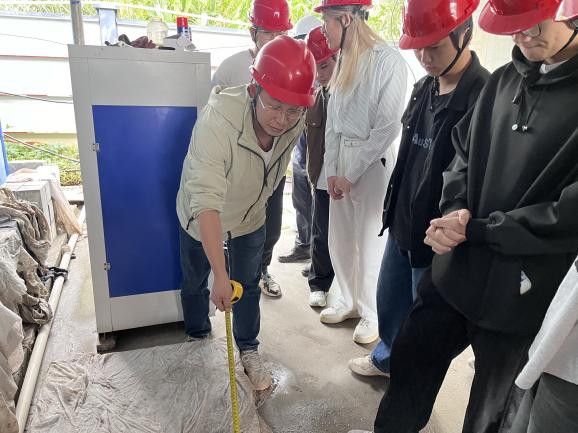 在工地區(qū)域,項目技術負責人李進鵬詳細講解模板流轉使用、塔吊布設注意事項、混凝土試塊養(yǎng)護設備操作規(guī)范等實踐知識。針對學生提出的銹蝕鋼筋處理、腳手架管件存放、塑料管材存儲要求等問題,李工結合工程實例逐一解答,讓學生直觀感受建筑施工 “高效、環(huán)保、質量可控”的優(yōu)勢。