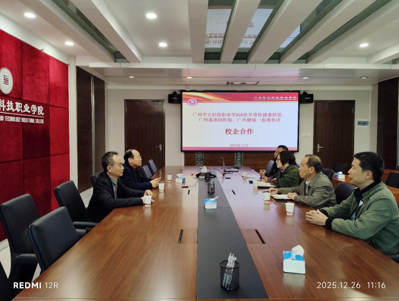 2025年12月26日,世界脊柱健康聯(lián)盟常務副主席、荔港國醫(yī)館館長、健強一指通集團董事長、一指通脊柱推拿療法創(chuàng)始人袁建強先生和世界脊柱健康聯(lián)盟首屆脊柱健康產業(yè)博覽會籌委會顧問陳國偉先生到訪我校,我校常務副校長馬俊、黨委副書記高堯來、中醫(yī)藥學院院長王暉和潘菽弢博士接待了袁館長一行。