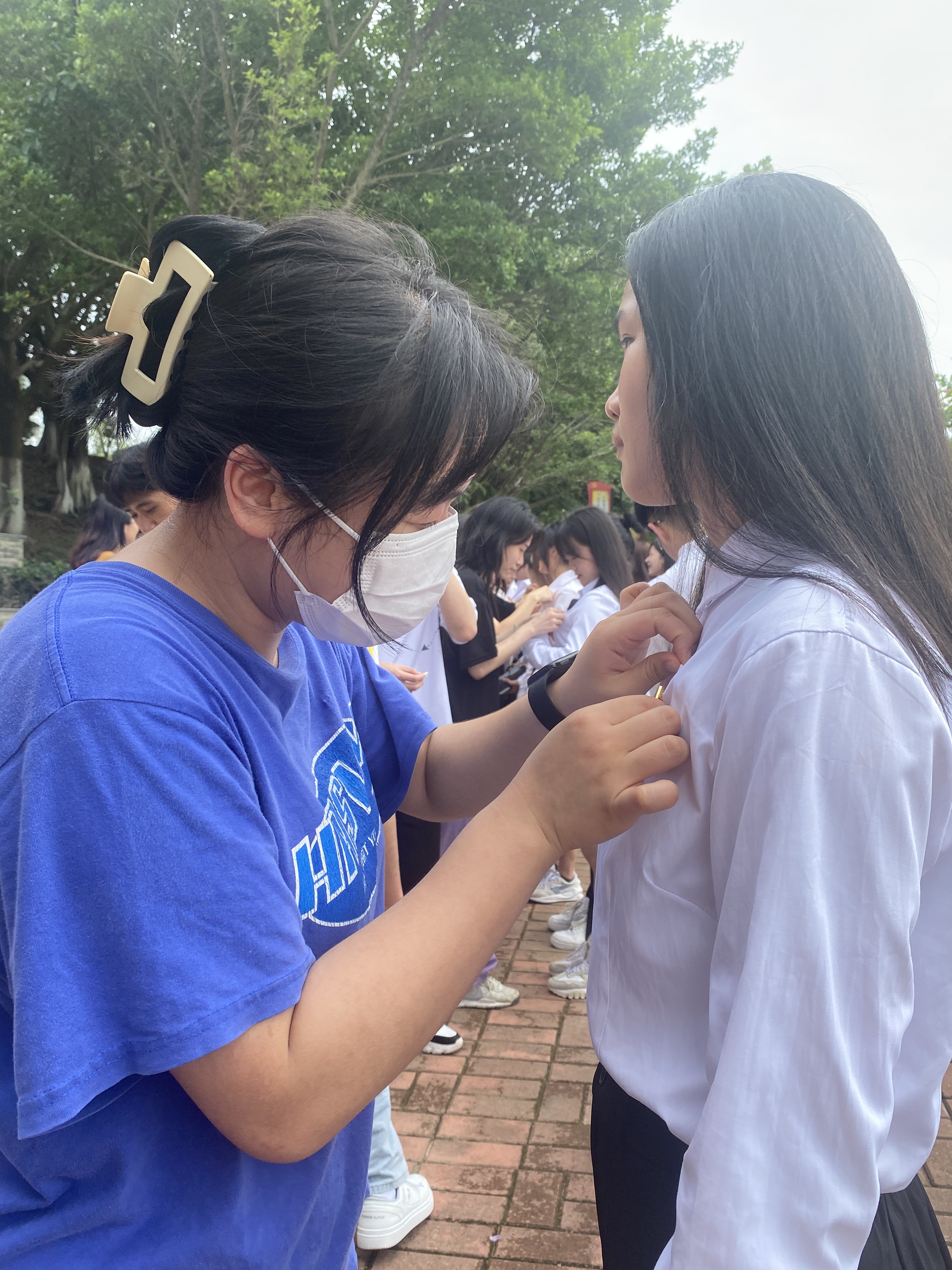 接下來,進行入黨宣誓儀式和佩戴黨徽。由宋依謎同志領誓,全體學生黨員舉起右手面對黨旗莊嚴宣誓。宣誓結束,老黨員為新黨員佩戴黨徽,叮囑新黨員牢記入黨宣誓,不忘使命,時刻以共產黨員的標準嚴格要求自己。
