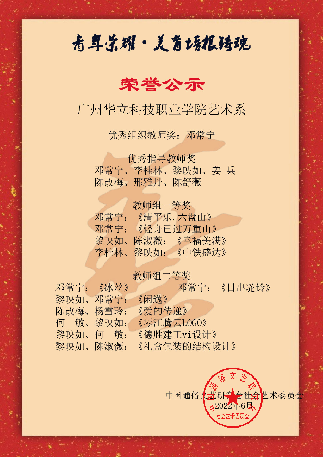 由中國(guó)通俗文藝研究會(huì)藝術(shù)委員會(huì)舉辦的第二屆全國(guó)“青年榮耀.美育培根鑄魂”青少年藝術(shù)成果展演比賽活動(dòng)中,我院教師、學(xué)生獲得優(yōu)異成績(jī),在這次大賽活動(dòng)中,我院鄧常寧、李桂林、邢雅丹、黎映如、姜兵、陳改梅、陳舒薇老師獲得優(yōu)秀指導(dǎo)老師獎(jiǎng),以上老師分別榮獲教師組一、二、三等獎(jiǎng)。我院29名學(xué)生獲得優(yōu)異成績(jī)。