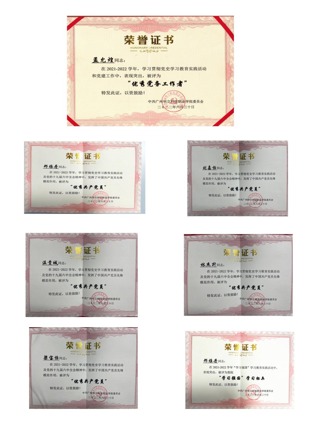2022年6月30日下午,我校在東區(qū)圖書館1號報告廳舉行七一表彰大會。其中,我院孟允煌同志被授予“優(yōu)秀黨務(wù)工作者”稱號;邢雅丹、劉嘉怡、梁寶怡(學(xué)生)、溫貴城(學(xué)生)、林杰升(學(xué)生)等同志被授予“優(yōu)秀共產(chǎn)黨員”稱號。此外,邢雅丹同志還被評為“學(xué)習(xí)強國”學(xué)習(xí)標兵。