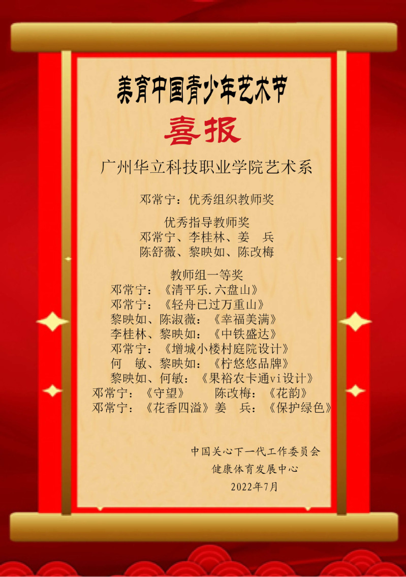 由中國關(guān)心下一代工作委員會(huì)舉辦的全國“美育青少年藝術(shù)節(jié)高校作品大賽”比賽活動(dòng)中,我院師生獲得優(yōu)異成績。在本次大賽活動(dòng)中,我院陳改梅、鄧常寧、李桂林、黎映如、姜兵、陳舒薇老師獲得優(yōu)秀指導(dǎo)老師獎(jiǎng),鄧常寧老師獲得優(yōu)秀組織獎(jiǎng)。以上老師分別榮獲教師組一、二等獎(jiǎng),我院有25名學(xué)生獲得優(yōu)異成績。