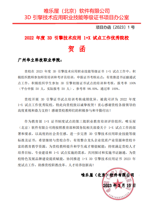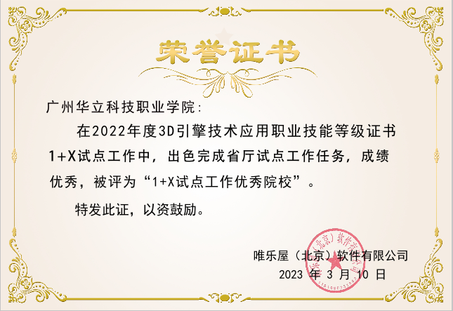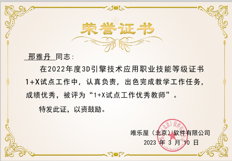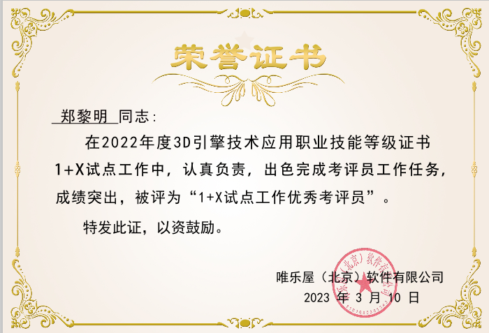 根據(jù)教育部、國務院相關部委和省教育廳關于1+X試點工作部署要求,在學校的領導下,我院在2022年度1+X 3D引擎技術應用職業(yè)技能等級證書試點建設工作中,積極組織師資培訓和考評員培訓,申報證書考核站點建設,有效推進書證融通試點工作,組織學生參加3D引擎技術初級證書試點的培訓和考核。在2022年度1+X 3D引擎技術應用初級技能等級證書的考核中成績優(yōu)異,參加考試通過率為100%,得到教育部證書考核評價組織高度認可,獲評為2022年度3D引擎技術應用1+X 試點工作優(yōu)秀院校。邢雅丹老師獲評為1+X 試點工作優(yōu)秀教師。鄭黎明老師獲評為1+X 試點工作優(yōu)秀考評員。