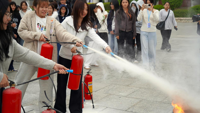 全體演練人員安全到達(dá)一樓空曠處后,由保衛(wèi)處老師教大家如何正確使用滅火設(shè)備,并組織師生進(jìn)行消防滅火設(shè)備實戰(zhàn)操作。