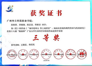五、2025年7月,在廣東省第十八屆“挑戰(zhàn)杯”大學(xué)生課外學(xué)術(shù)科技作品競賽決賽中,藝傳師生斬獲“挑戰(zhàn)杯”省賽“二等獎”1項(xiàng),“三等獎”1項(xiàng),充分展現(xiàn)了藝傳學(xué)院青年學(xué)子以專業(yè)所學(xué)服務(wù)鄉(xiāng)村振興戰(zhàn)略的責(zé)任擔(dān)當(dāng)與創(chuàng)新實(shí)踐,更展現(xiàn)了學(xué)校以產(chǎn)教融合助力“百千萬工程”的積極實(shí)踐,助力嶺南文化名片在新時代綻放光彩。