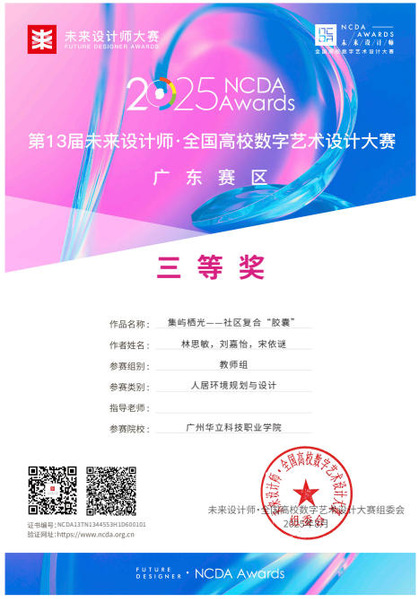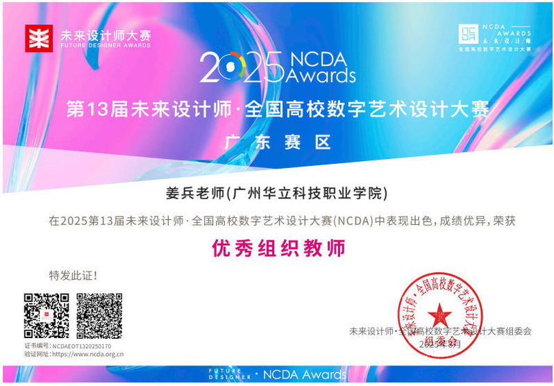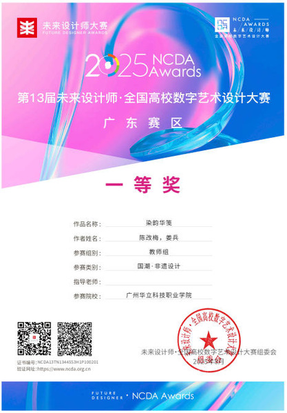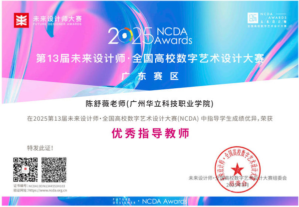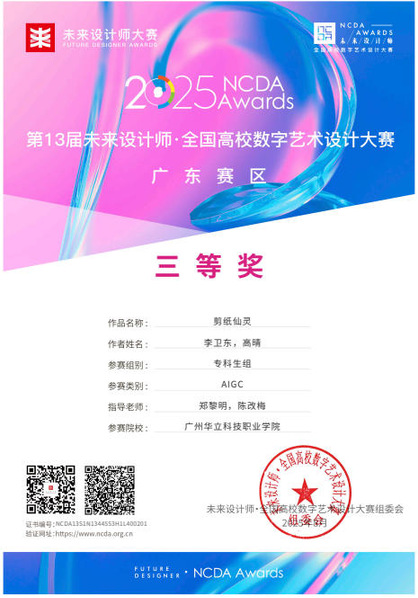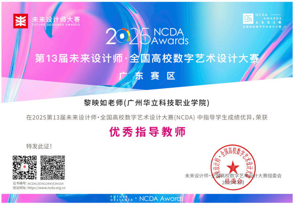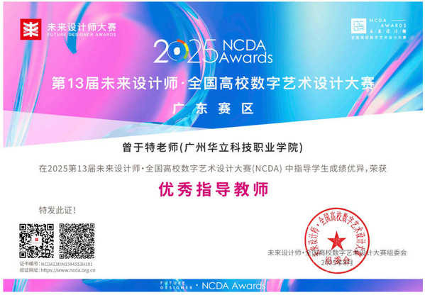 九、2025年8月,未來設(shè)計師·全國高校數(shù)字藝術(shù)設(shè)計大賽(NCDA)是入選《全國普通高校大學(xué)生競賽排行榜》,近20家省教育廳認(rèn)定,“學(xué)習(xí)強(qiáng)國”學(xué)習(xí)平臺支持,對接聯(lián)合國國際賽的全國性大學(xué)生競賽。是高校教育教學(xué)改革和創(chuàng)新人才培養(yǎng)的重要競賽項(xiàng)目之一,具有極高的知名度與影響力。在第13屆未來設(shè)計師·全國高校數(shù)字藝術(shù)設(shè)計大賽(NCDA)中,藝術(shù)與傳媒學(xué)院師生在廣東省賽區(qū)共獲獎12項(xiàng)。其中,我校獲得優(yōu)秀組織單位獎1項(xiàng);學(xué)生組“一等獎”2項(xiàng),“三等獎”2項(xiàng);教師組“一等獎”1項(xiàng),“三等獎”1項(xiàng);“優(yōu)秀指導(dǎo)教師獎”4項(xiàng);“優(yōu)秀組織教師獎”1項(xiàng)。