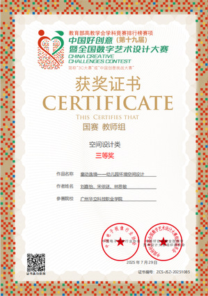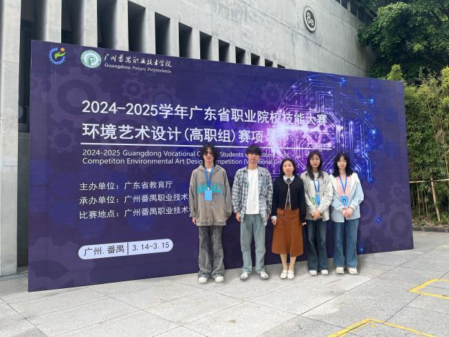 二、2025年4月,由廣東省教育廳主辦、廣州番禺職業(yè)技術(shù)學(xué)院承辦的2024—2025學(xué)年廣東省職業(yè)院校技能大賽環(huán)境藝術(shù)設(shè)計賽項(xiàng),藝傳學(xué)子謝梁英、鐘曉婷、謝志煒、黎永豪在馬英超、謝瑞祥老師指導(dǎo)下,最終在全省65支參賽隊(duì)伍、200多名選手中脫穎而出,榮獲“三等獎”。