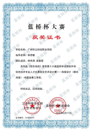 四、2025年6月,“藍(lán)橋杯全國軟件和信息技術(shù)專業(yè)人才大賽”由工業(yè)和信息化部人才交流中心主辦,連續(xù)多年入選中國高等教育學(xué)會“全國普通高校學(xué)科競賽排行榜”。本屆大賽省賽在全國31個省市自治區(qū)舉辦,來自北京大學(xué)、清華大學(xué)、復(fù)旦大學(xué)、上海交通大學(xué)等1900多所高校的23萬名選手同臺競技。在第十六屆“藍(lán)橋杯?視覺藝術(shù)設(shè)計大賽”藝術(shù)與傳媒學(xué)院學(xué)子斬獲“一等獎”2項(xiàng)、“二等獎”1項(xiàng)、“三等獎”5項(xiàng)。