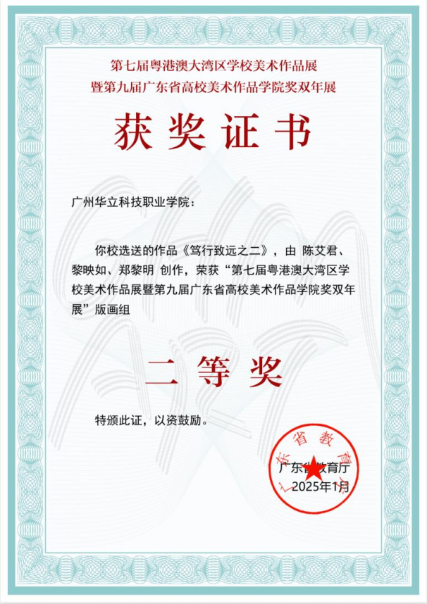 一、2025年1月,廣東省教育廳頒發(fā)了第七屆粵港澳大灣區(qū)學(xué)校美術(shù)作品展暨第九屆廣東省高校美術(shù)作品學(xué)院獎雙年展的獲獎證書。其中,陳艾君、黎映如、鄭黎明三位教師共同創(chuàng)作的版畫作品《篤行致遠(yuǎn)之二》榮獲“二等獎”,唐青教師的作品《金牛福虎登高峰》則榮獲“三等獎”。這些榮譽(yù)不僅是對教師個人藝術(shù)造詣的高度肯定,更凸顯了學(xué)院教師在藝術(shù)創(chuàng)作上風(fēng)格多元、勇于創(chuàng)新的特質(zhì)。