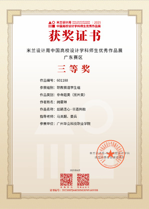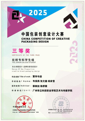 六、2025年7月,“全國大學(xué)生廣告藝術(shù)大賽”作為國內(nèi)規(guī)模龐大、覆蓋面廣、極具影響力的高校文科競賽,始終致力于激發(fā)大學(xué)生的創(chuàng)新活力與實(shí)踐能力。2025年第17屆全國大學(xué)生廣告藝術(shù)大賽(大廣賽)廣東賽區(qū)藝術(shù)與傳媒學(xué)院選送作品中《繁花與齒》在產(chǎn)品與包裝設(shè)計類別中脫穎而出,其創(chuàng)意構(gòu)思與視覺呈現(xiàn)獲得了賽事評委的高度認(rèn)可,成功斬獲省級“三等獎”。