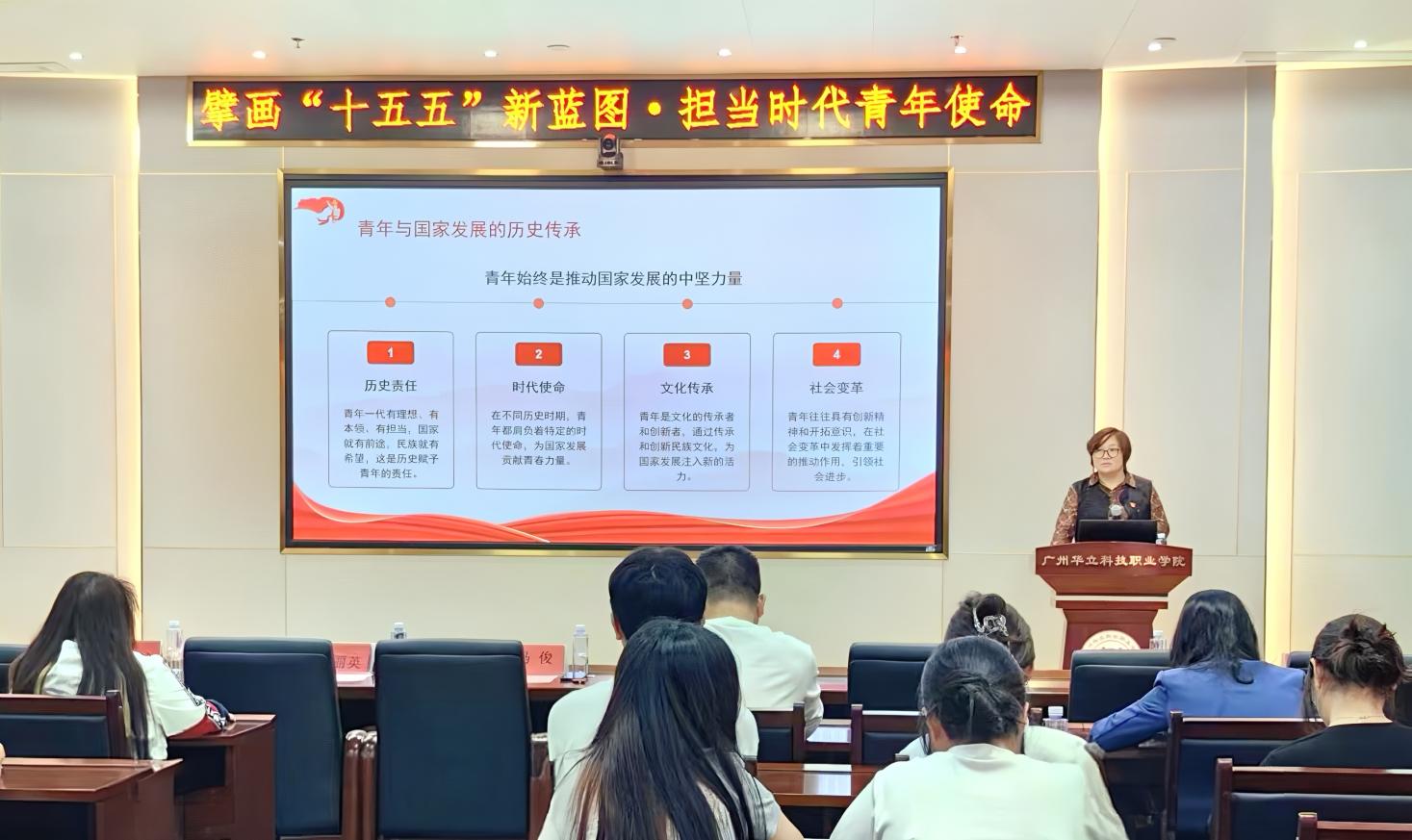 為引導(dǎo)青年學(xué)子讀懂國家發(fā)展大勢,找準(zhǔn)職業(yè)定位,提振學(xué)習(xí)成才的激情和動力,以實干擔(dān)當(dāng)奔赴新征程,3月18日,在圖書館104會議室,學(xué)校常務(wù)副校長馬俊教授以“擘畫‘十五五’新藍(lán)圖·擔(dān)當(dāng)時代青年使命”為主題,為藝術(shù)與傳媒學(xué)院師生帶來一堂有深度、有溫度、有力度的思政第一課,學(xué)院黨總支書記陳改梅、院長朱君、黨總支專職副書記劉嘉怡參加聽課。學(xué)生代表齊聚課堂,認(rèn)真聆聽、深入思考,現(xiàn)場氛圍莊重而熱烈。