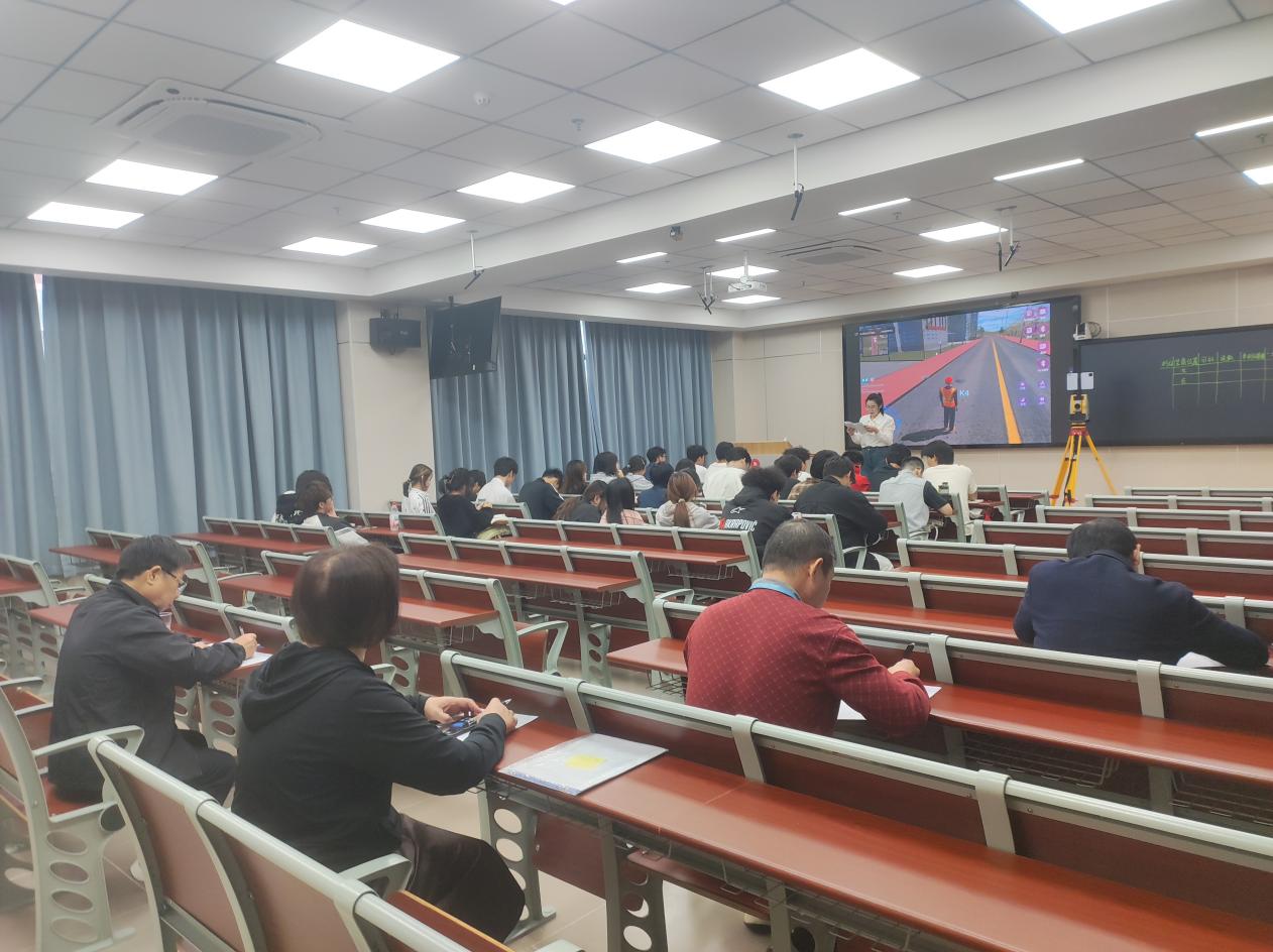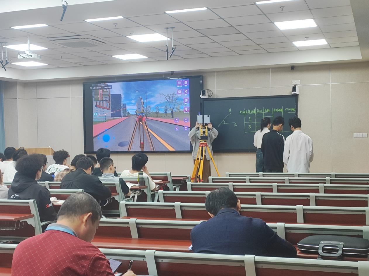 “測繪是工程建設(shè)的‘眼睛’,而全站儀就是這雙眼睛的核心工具?!闭n程伊始,賈相蘋老師簡潔明了地介紹了儀器的發(fā)展歷程、核心功能及在建筑、地質(zhì)、交通等領(lǐng)域的應(yīng)用場景。為打破傳統(tǒng)課堂“重理論、輕實踐”的局限,本次課程特別引入虛擬仿真系統(tǒng)——虛實一體云協(xié)同虛擬仿真平臺,通過構(gòu)建沉浸式測繪作業(yè)環(huán)境,學生們仿佛置身現(xiàn)場。教師結(jié)合虛擬仿真平臺,將抽象的 “大地坐標系”“高程測量” 等理論知識轉(zhuǎn)化為可視化的動態(tài)畫面,原本晦澀的公式推導、原理闡釋,通過與真實工程案例的結(jié)合,變得清晰易懂?,F(xiàn)場學生不時舉手提問,教師則借助交互屏幕實時標注、拆解關(guān)鍵環(huán)節(jié),讓理論學習不再 “紙上談兵”。