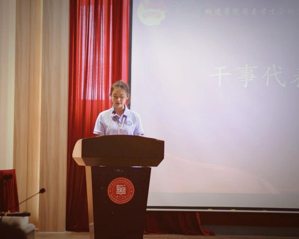 干事代表黃欣瑩身著會(huì)服,以飽滿的精神狀態(tài)登臺(tái)發(fā)言。她言辭懇切、意氣風(fēng)發(fā),不僅表達(dá)了對(duì)加入團(tuán)委學(xué)生會(huì)大家庭的榮幸與喜悅,更展現(xiàn)出投身學(xué)生工作、服務(wù)集體發(fā)展的滿腔熱忱,讓現(xiàn)場(chǎng)感受到新生力量的蓬勃朝氣與無限潛能。
