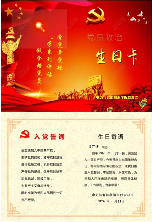 作為電力與智能制造學院云浮校區(qū)的一名教師黨員甘芳婷,2024年6月19日早上,收到了學院黨組織發(fā)的“政治生日”賀卡,我的心情特別興奮,也感謝組織的關懷。6月19日,是我的政治生日,火紅的黨旗永遠飄揚在我心中,莊嚴的入黨誓詞永遠融入我靈魂深處,它已轉化成我行動的力量,使我以堅強的黨員意志投入到黨的工作中,甘于拼搏奉獻。