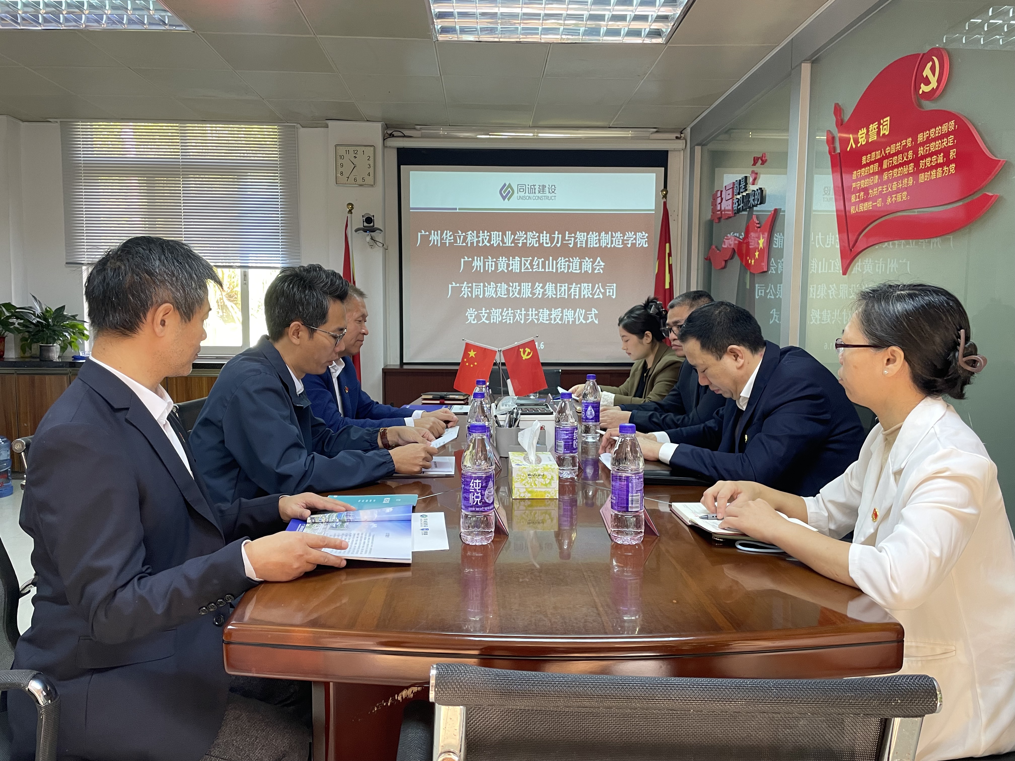 為深入推進(jìn)學(xué)院“雙帶頭人”教師黨支部書記“廣東行”專項(xiàng)行動,更好發(fā)揮“雙帶頭人”教師黨支部書記的示范引領(lǐng)作用,促進(jìn)校企黨建工作交流與合作。11月6日,電力與智能制造學(xué)院教師黨支部與廣州市黃埔區(qū)紅山街道商會、廣東同誠建設(shè)服務(wù)集團(tuán)有限公司黨支部,在廣東同誠建設(shè)服務(wù)集團(tuán)有限公司會議室舉行了結(jié)對共建儀式。