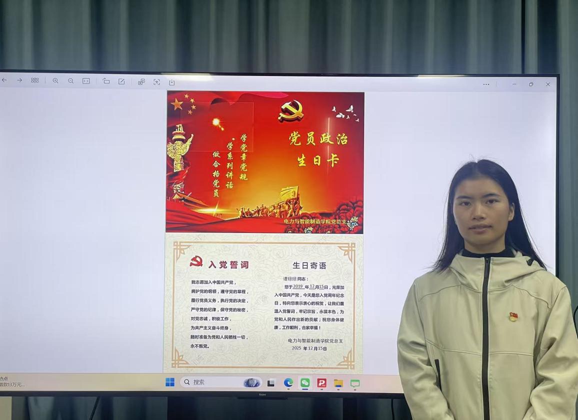 作為電力與智能制造學(xué)院的一名黨員教師譚瓊瓊,2025年12月15日收到學(xué)院黨總支發(fā)來的“政治生日”賀卡,我的心情無比激動(dòng)并心懷感恩,加入黨組織已有6年,站在這個(gè)兼具榮耀與責(zé)任的特殊節(jié)點(diǎn),回望一年來在黨建引領(lǐng)下的育人之路,心中滿是感恩與堅(jiān)定。