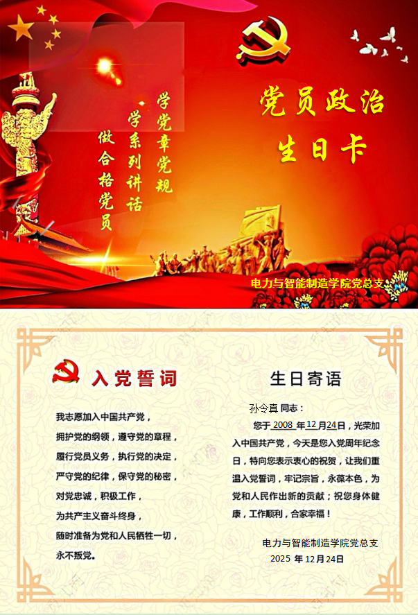 作為電力與智能制造學(xué)院教師黨支部書記孫令真,12月24日早上收到了學(xué)院黨組織發(fā)的“政治生日”賀卡,心情特別興奮,2008年12月24日是我加入中國(guó)共產(chǎn)黨的日子。