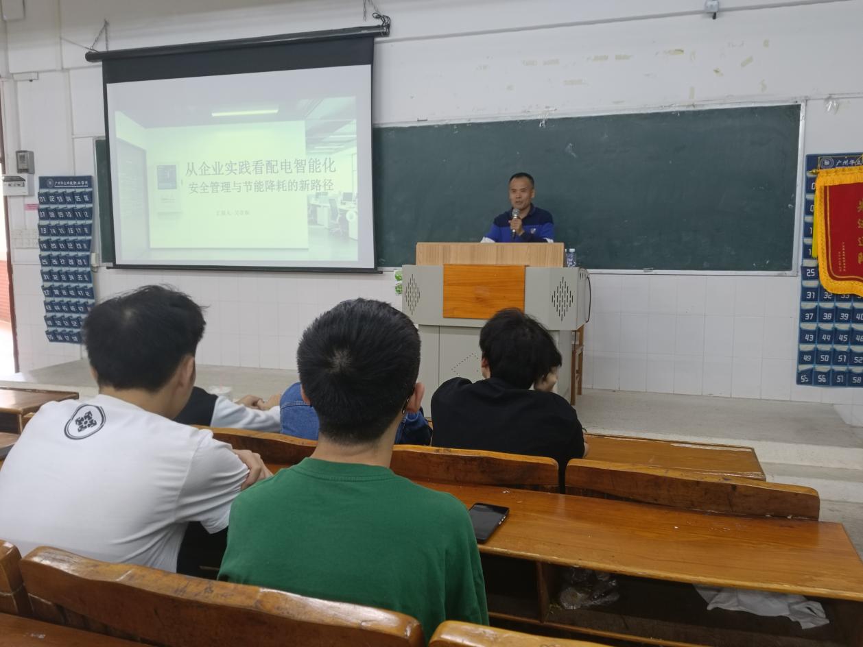 講座現(xiàn)場,吳貴和副董事長圍繞主題,結(jié)合自身數(shù)十年的企業(yè)實踐經(jīng)驗及廣州銀變電力的發(fā)展歷程,從配電智能化的發(fā)展背景、核心技術(shù)應(yīng)用入手,重點講解了企業(yè)在配電安全管理中的實操要點、常見隱患排查方法,以及節(jié)能降耗領(lǐng)域的創(chuàng)新技術(shù)與實踐路徑。他摒棄晦澀的理論說教,采用“理論+企業(yè)真實案例”的方式,結(jié)合廣州銀變電力在配電設(shè)備智能化升級中的實踐,以及行業(yè)內(nèi)利用“物聯(lián)網(wǎng)+大數(shù)據(jù)”實現(xiàn)智慧用電、節(jié)能降耗的典型案例,生動剖析了配電智能化系統(tǒng)在安全管控、能效優(yōu)化中的應(yīng)用場景,分享了企業(yè)通過智能化改造實現(xiàn)安全升級、降低能耗的成功經(jīng)驗——如通過智能監(jiān)測終端實時采集電氣參數(shù)、排查安全隱患,有效提升供電可靠性,同時降低線損與人工運維成本,讓在場學(xué)生對配電智能化的實踐價值有了直觀且深刻的認(rèn)知。