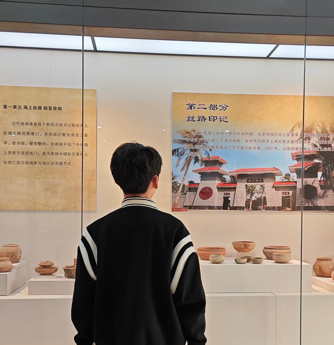 25級(jí)電力4班的陳宣任同學(xué),參觀了其家鄉(xiāng)的徐聞縣博物館。他表示,通過觀看“海上絲路始發(fā)徐聞”和“絲路印記”等實(shí)物擺件和照片,消除了他對(duì)這段歷史的陌生感。原來早在漢代,徐聞這座港口就已成為官方記載的海上絲路起點(diǎn),那些被精心擺放的陶器,或許曾裝載過絲綢與瓷器,順著季風(fēng)駛向東南亞乃至更遠(yuǎn)的海域。同時(shí)他表示,博物館里的物件,不再是冰冷的古物,而是鮮活的見證,讓他真切地觸摸到“萬里絲路”不是書本里的抽象概念,而是由無數(shù)艘商船、無數(shù)次遠(yuǎn)航編織成的文明紐帶。而當(dāng)他走出展廳時(shí),陽光透過玻璃灑在那些陶器上,泛起溫潤(rùn)的光澤。讓他忽然間明白,博物館的意義,正是讓我們?cè)谂c歷史的對(duì)話中讀懂自己——徐聞港的帆影早已遠(yuǎn)去,但它留下的開放與探索精神,依然在今天的海風(fēng)中延續(xù)著。