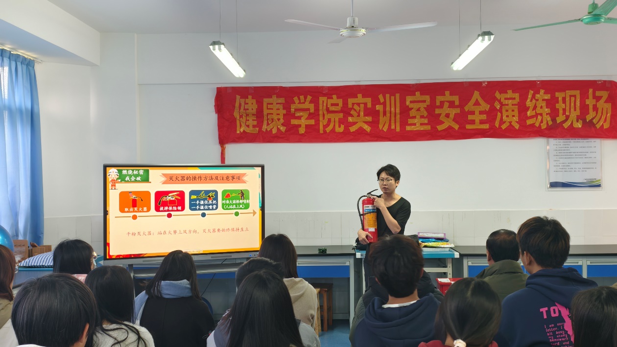 隨后,健康學(xué)院實驗員對實訓(xùn)室常見安全隱患、室內(nèi)安全距離、火場逃生與自救以及干粉滅火器的使用方法等方面進行講解,為同學(xué)們就實訓(xùn)室安全問題進行科普講解。