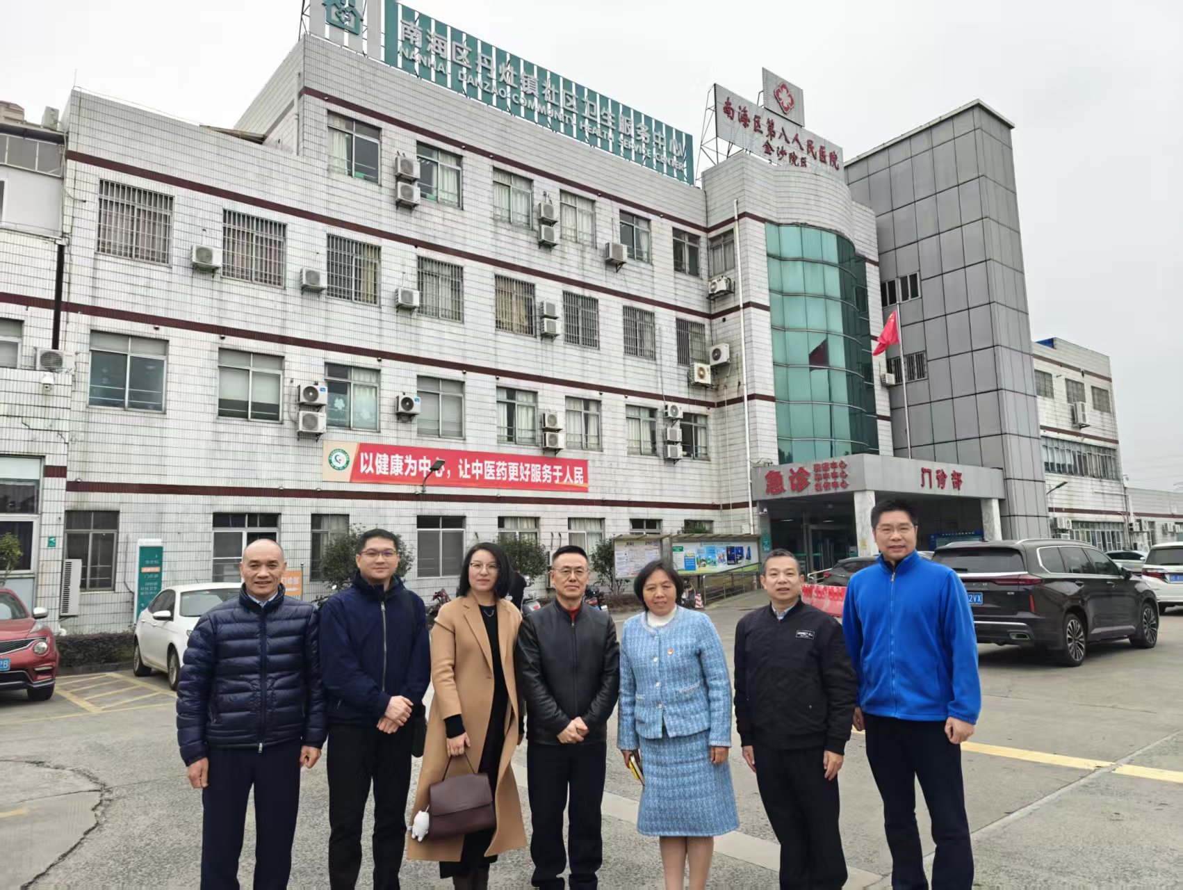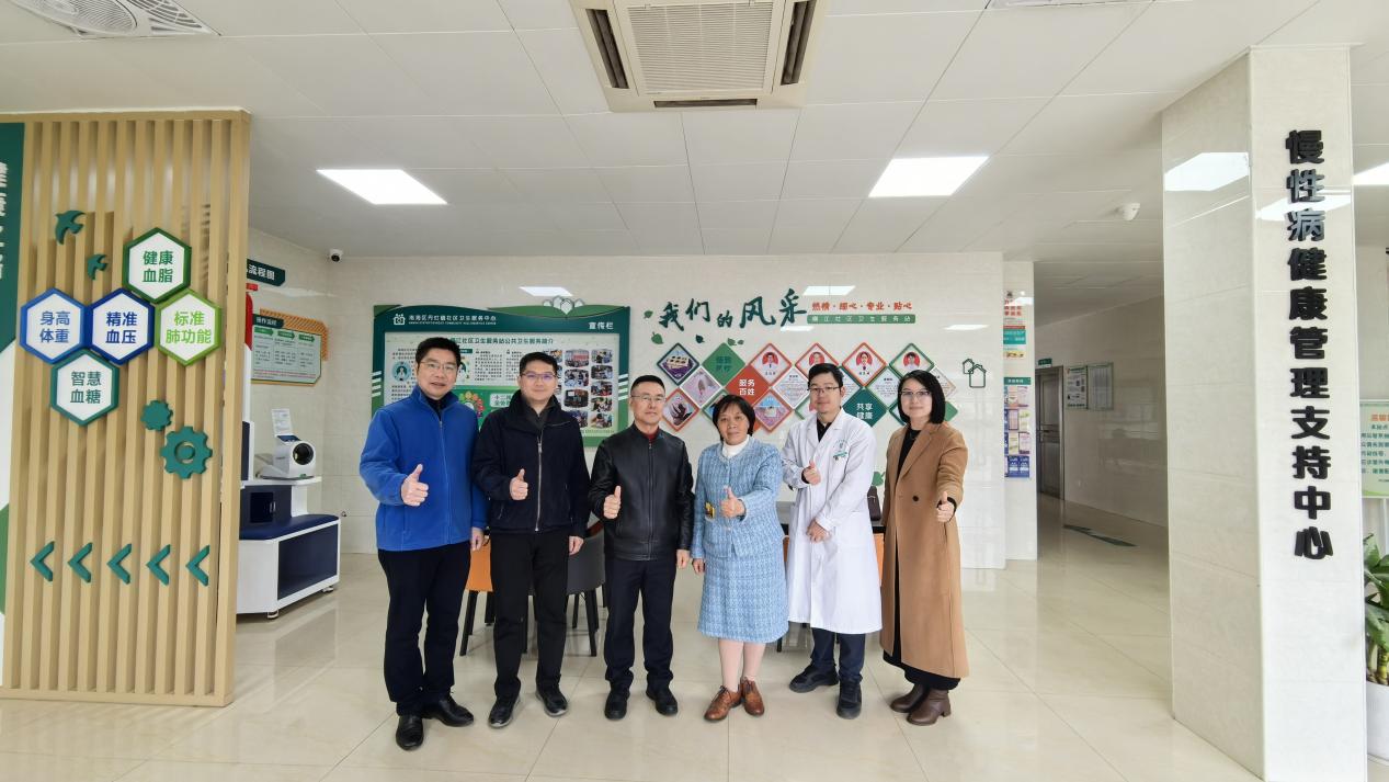 健康學院羅琴芳博士參觀兒童一體化門診,與丹灶社區(qū)衛(wèi)生服務中心何立華主任等負責人樓前合影