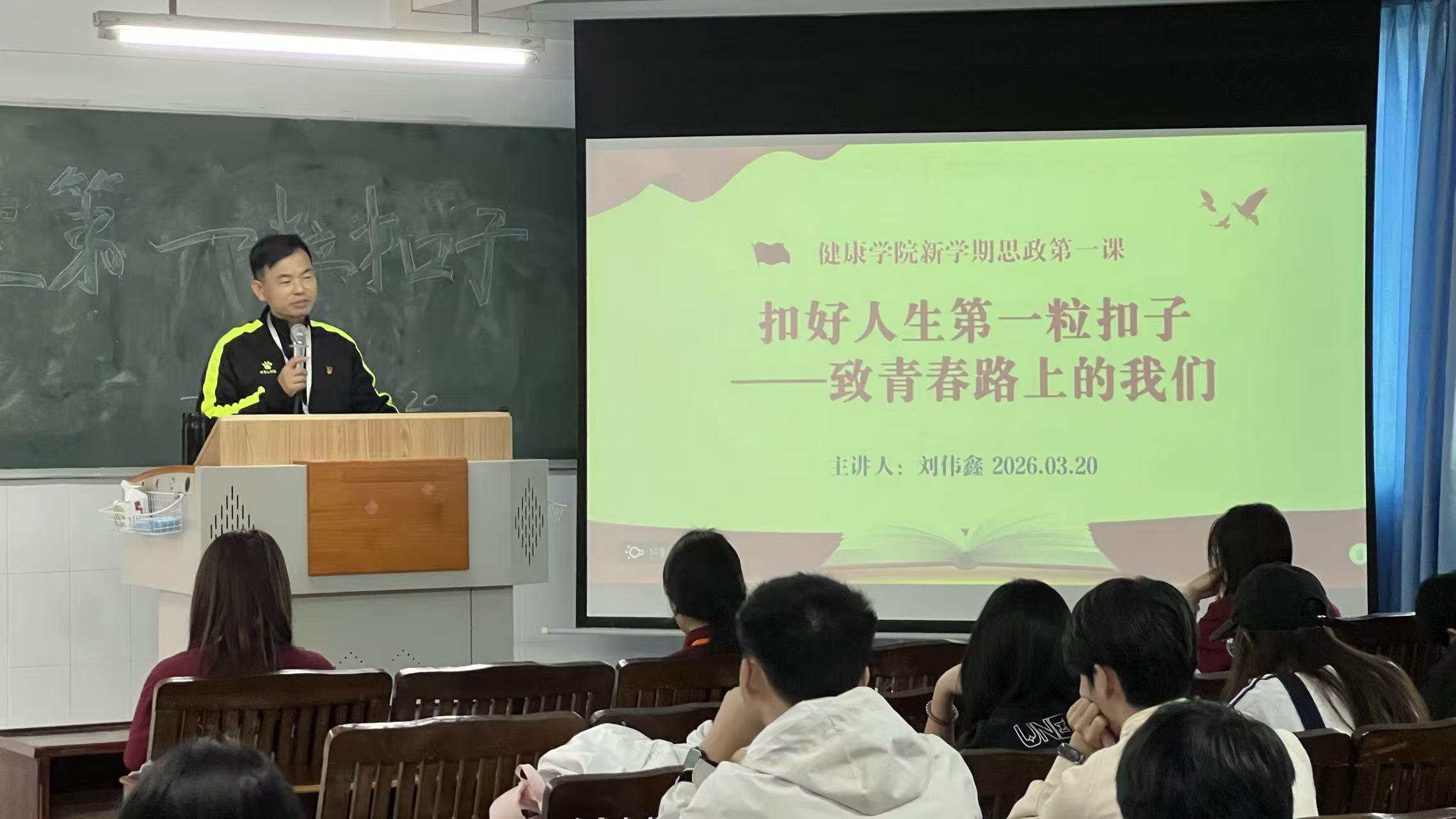 2026年3月20日上午,健康學院開展以“扣好人生第一??圩印虑啻郝飞系奈覀儭睘橹黝}的新學期思政第一課,課程由學院直屬黨支部書記劉偉鑫同志主講,為學院部分學生帶來了一場深刻的思想洗禮,引導青年學子在青春路上樹立正確的價值導向,筑牢成長根基。