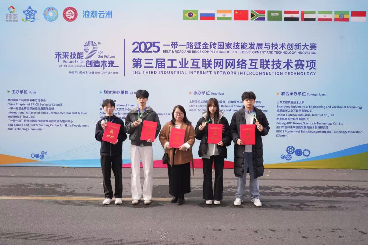 2025年11月7日-9日,2025年“一帶一路”暨金磚國(guó)家技能發(fā)展與技術(shù)創(chuàng)新大賽第三屆工業(yè)互聯(lián)網(wǎng)網(wǎng)絡(luò)互聯(lián)技術(shù)賽項(xiàng)全國(guó)總決賽在山東工程職業(yè)技術(shù)大學(xué)隆重舉行,吸引了來自全國(guó)81所院校的132支參賽隊(duì)伍同場(chǎng)競(jìng)技。我校計(jì)算機(jī)信息工程學(xué)院閔小翠、王建華老師指導(dǎo)選派的兩支代表隊(duì)(1隊(duì):馮俊杰,劉俊浩、2隊(duì):彭依琳,魏淙正),在全國(guó)總決賽賽場(chǎng)上,歷經(jīng)四小時(shí)的激烈比拼,最終憑借扎實(shí)的專業(yè)知識(shí)、科學(xué)的團(tuán)隊(duì)協(xié)作,最終脫穎而出,榮獲全國(guó)總決賽二等獎(jiǎng)1項(xiàng)、三等獎(jiǎng)1項(xiàng),為學(xué)校贏得榮譽(yù)。我校榮獲“優(yōu)秀組織獎(jiǎng)”、兩位指導(dǎo)教師榮獲“優(yōu)秀指導(dǎo)教師”稱號(hào)。