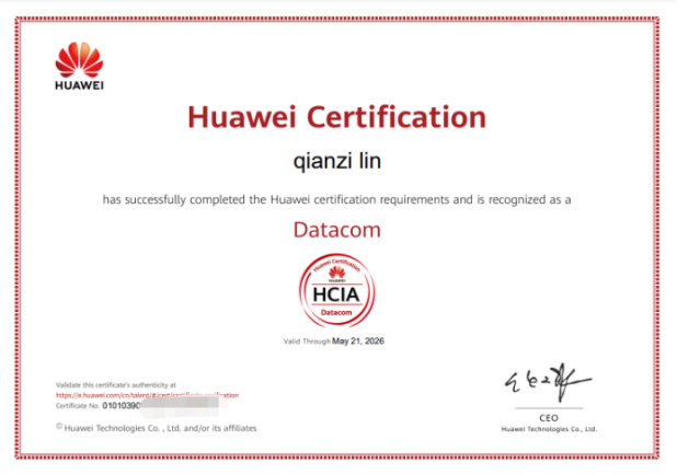 (圖6 學(xué)生HCIP高級網(wǎng)絡(luò)工程師證書) |