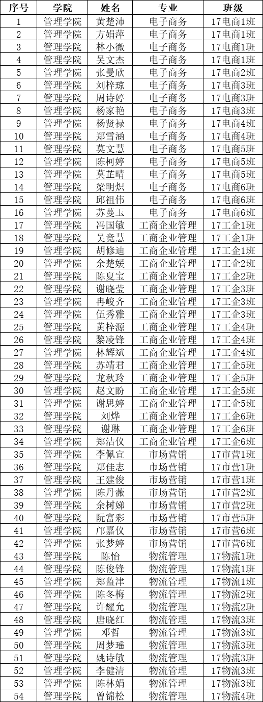 根據(jù)廣州華立科技職業(yè)學(xué)院下發(fā)《華立職院學(xué)〔2020〕21號(hào)關(guān)于評(píng)選2020屆優(yōu)秀畢業(yè)生的通知》,為表彰先進(jìn),進(jìn)一步調(diào)動(dòng)廣大同學(xué)們學(xué)習(xí)、就業(yè)的積極性,激發(fā)同學(xué)們奮發(fā)向上,創(chuàng)建良好的學(xué)風(fēng)校風(fēng),在就業(yè)創(chuàng)業(yè)中努力進(jìn)取,管理學(xué)院應(yīng)學(xué)校要求在2020屆畢業(yè)生中開展評(píng)選優(yōu)秀畢業(yè)生的活動(dòng)。經(jīng)個(gè)人申請(qǐng),管理學(xué)院輔導(dǎo)員、校外實(shí)習(xí)指導(dǎo)老師共同推薦,學(xué)院領(lǐng)導(dǎo)審核,我學(xué)院擬將推薦黃楚沛等54位同學(xué)為2020屆優(yōu)秀畢業(yè)生?,F(xiàn)將2020屆優(yōu)秀畢業(yè)生的名單公示如下(具體名單見下表):