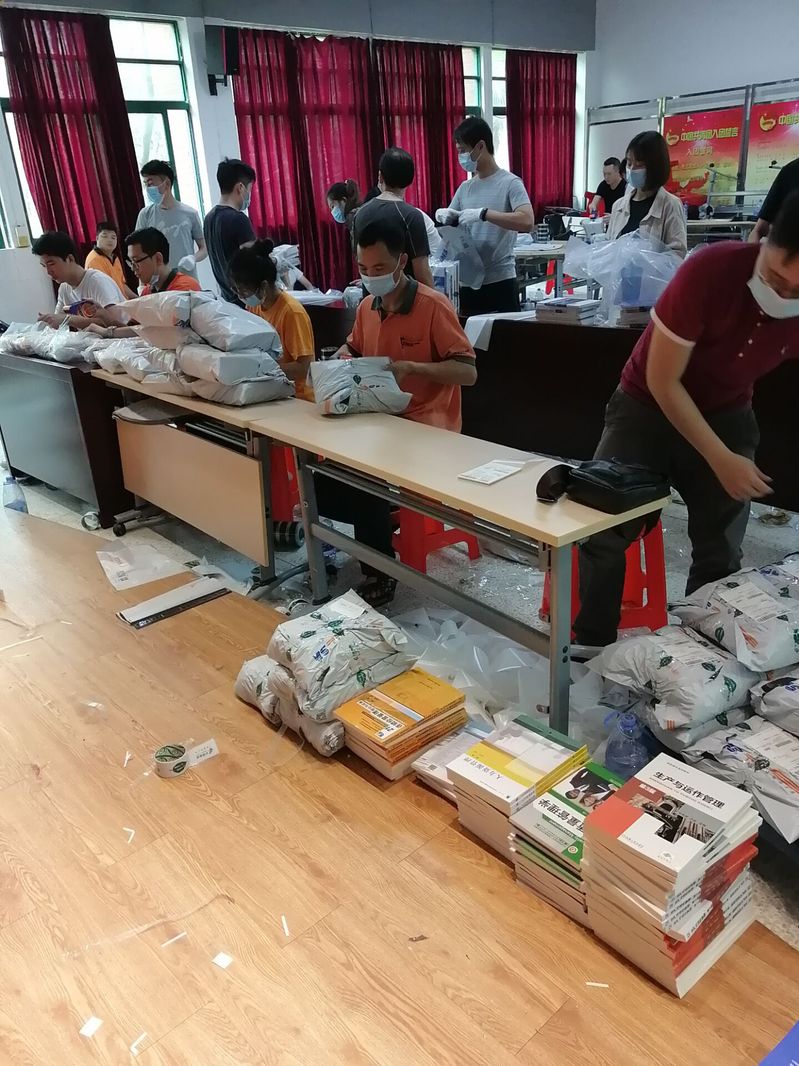 在疫情期間,我院遵照教育部門及學(xué)校的要求,及時開展了網(wǎng)絡(luò)教學(xué)工作。為充分保證學(xué)生線上學(xué)習(xí)的效果,最大限度降低疫情對教育教學(xué)和學(xué)生學(xué)習(xí)的影響,學(xué)校與郵政快遞公司合作,為疫情期間不能返校的學(xué)生及時郵寄了全部教材。5月14-16日三天,在教務(wù)處統(tǒng)一安排下,我院領(lǐng)導(dǎo)高度重視,組織安排了四線主任唐濤、王映麗、李遠興、康信恩,以及居住在增城附近的汪蔚、黃英、韋玉、趙林創(chuàng)老師參與了學(xué)生教材的分揀、打包、郵寄工作,將線上教學(xué)需要使用的學(xué)習(xí)、教材、資料及時送到學(xué)生手中。
