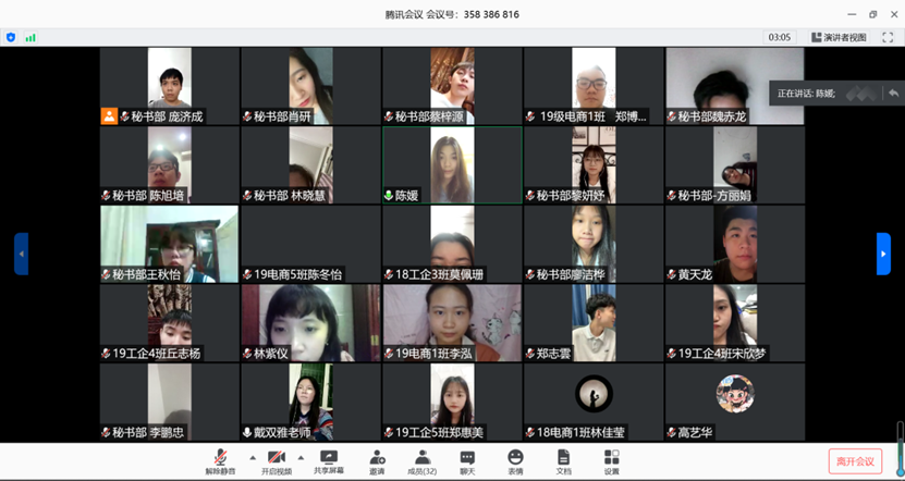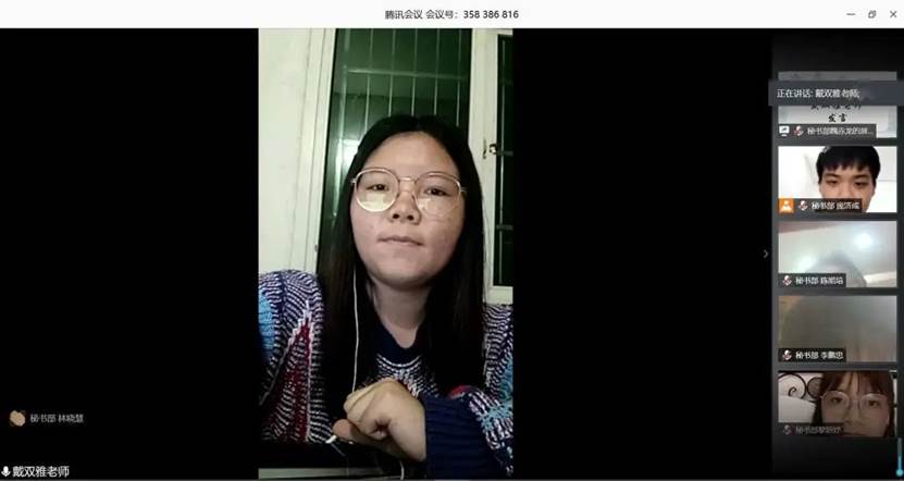 首先,由管理學院團總支書記陳媛老師講話,她說到:對脫穎而出進入決賽的10位同學表示祝賀,線上演講給予同學們一個自我展示的機會,同時也能讓同學們在繁重的網(wǎng)課學習期間里帶來一些豐富多彩的活動,同時預祝同學們在比賽中取得優(yōu)異的成績。