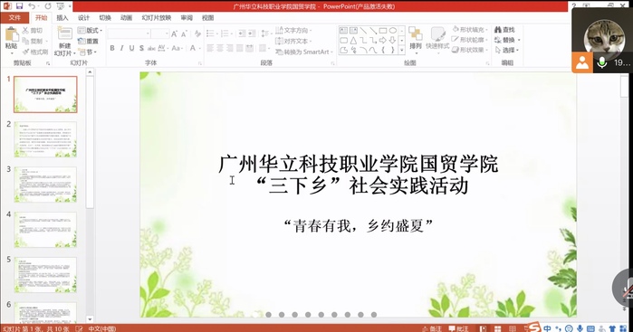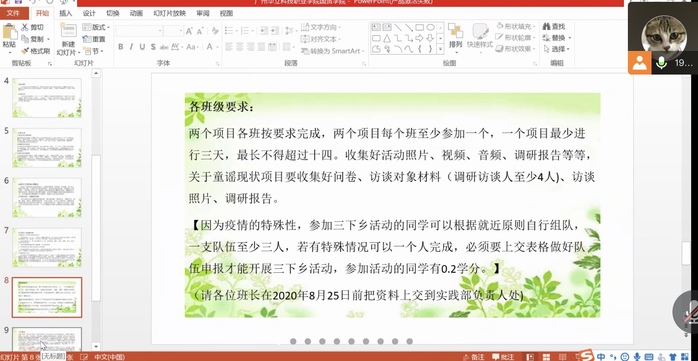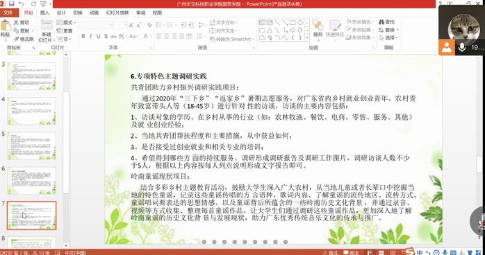首先,陳馨妍同學(xué)給大家講述活動(dòng)的主題,是以“青春助力脫貧,共奔幸福小康”為主題的三下鄉(xiāng)社會(huì)實(shí)踐活動(dòng)。講解活動(dòng)的總體思路,要結(jié)合新冠肺炎疫情常態(tài)化防控要求,鼓勵(lì)學(xué)生結(jié)合相對(duì)貧困地區(qū)疫情和愛國衛(wèi)生運(yùn)動(dòng)工作要求,在家鄉(xiāng)就近開展社會(huì)實(shí)踐活動(dòng),活動(dòng)要求突出主題,確保安全,就近就便,創(chuàng)新行式。