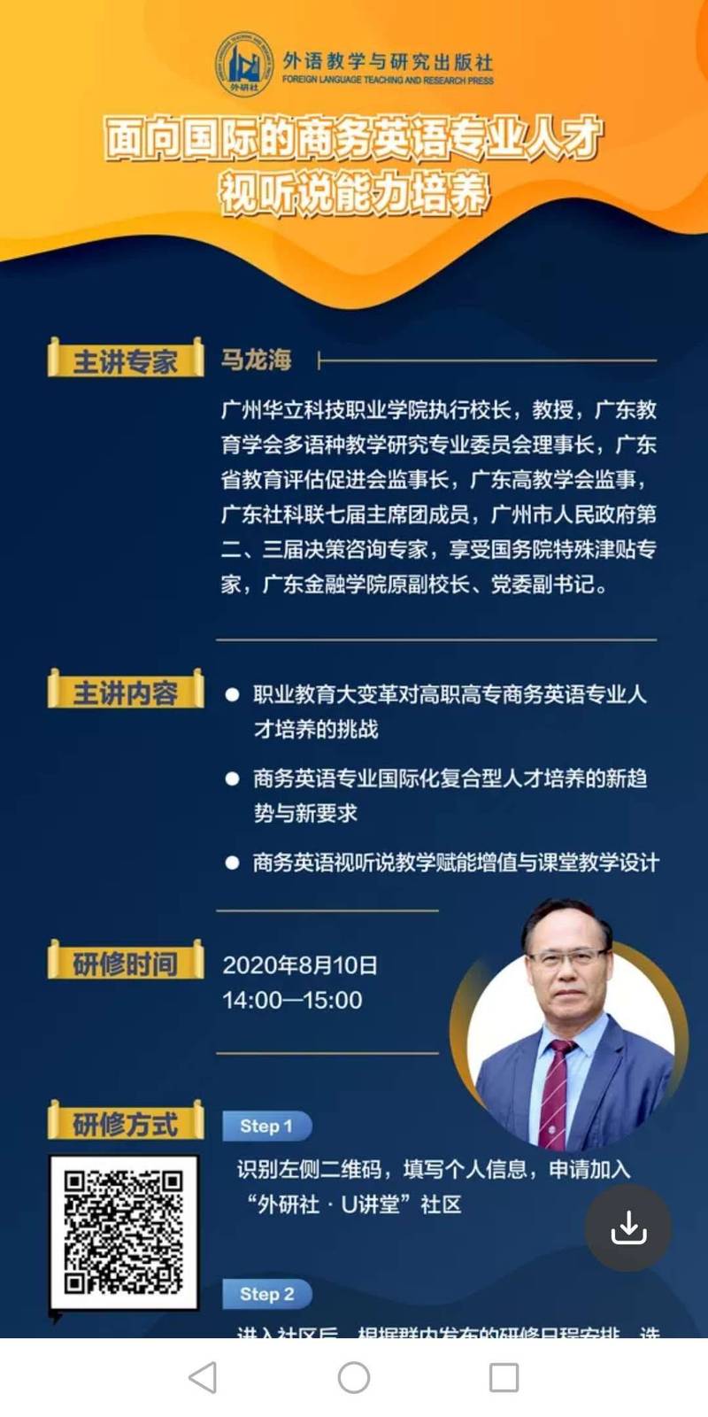 8月10日下午2:00,“外研社·U講堂社區(qū)”直播講座在釘釘群如期舉行。廣州華立科技職業(yè)學院馬龍海教授為大家?guī)砹恕睹嫦驀H的商務(wù)英語人才視聽說能力培養(yǎng)》主題講座。