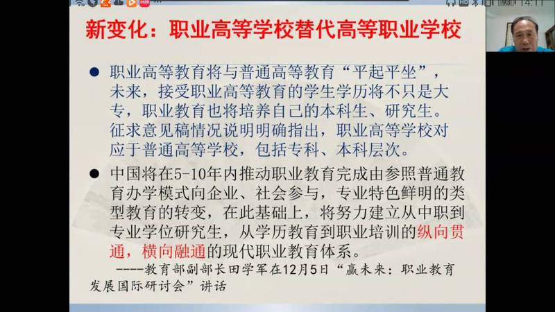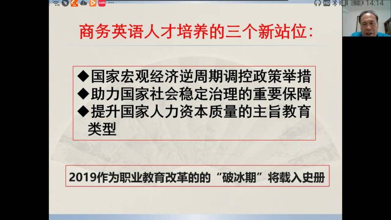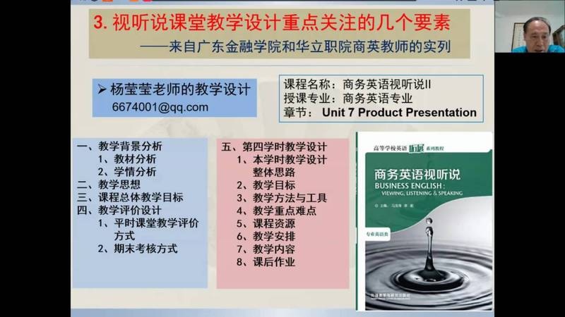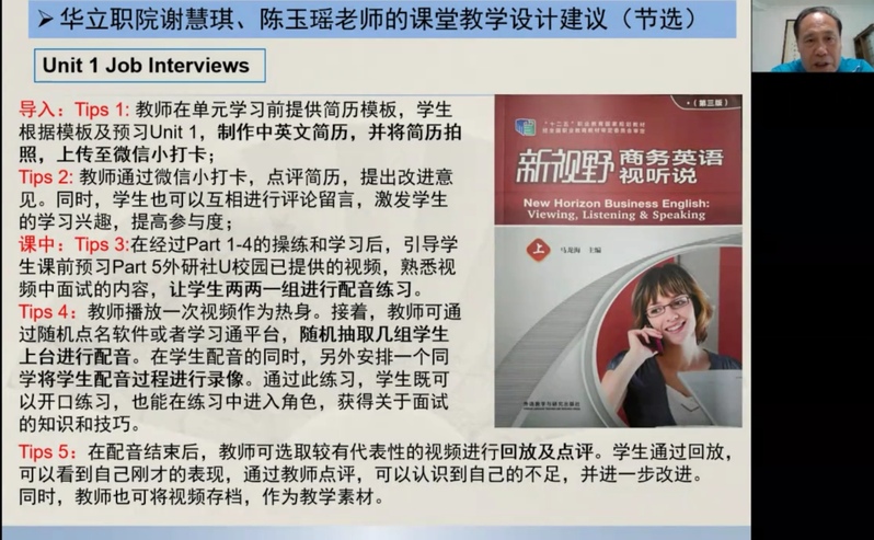 直播講座中,馬龍海教授就職業(yè)教育大變革對高職高專商務(wù)英語專業(yè)人才培養(yǎng)的挑戰(zhàn)進行了詳細解讀,幫助教師深化了對職業(yè)教育大變革帶來的“三個新站位”,四個“新定位”的認識,并指出內(nèi)涵發(fā)展是適應(yīng)職業(yè)教育改革的必然選擇。分析了商務(wù)英語專業(yè)國際化復(fù)合型人才培養(yǎng)的新趨勢與新要求,要培養(yǎng)適應(yīng)現(xiàn)代化的復(fù)合型人才應(yīng)聚焦和回歸到課程改革,因為課程是學生消費高等教育資源的基本單位,是高等學校一切辦學行為和人財物資資源配置的最終載體,是學校人才培養(yǎng)質(zhì)量內(nèi)涵建設(shè)水平的標志和落腳點,決定著學校品牌影響力與核心競爭力的形成。并從理念更新取向、體系構(gòu)建取向、教學能力取向、方法載體取向四個維度,就如何進行課程建設(shè)提出建議。馬龍海教授強調(diào),在職業(yè)教育課程體系構(gòu)建的關(guān)鍵點是工作過程導(dǎo)向;教師要作學生成長的引路人,要注重交叉跨界能力;產(chǎn)教融合是職業(yè)教育的精髓和改革方向,在每一點的講解中,馬龍海教授都結(jié)合了《新視野商務(wù)英語綜合教程(智慧版)》或《新視野商務(wù)英語視聽說(第三版)》的教材編寫理念,以之為例,說明如何落實課程改革,如何培養(yǎng)商務(wù)復(fù)合型人才,如何結(jié)合現(xiàn)代化信息技術(shù)手段。商務(wù)英語視聽說教學應(yīng)進一步明確培養(yǎng)目標,創(chuàng)新商務(wù)英語人才培養(yǎng);對標教學效能標準;打造適應(yīng)“新商科”發(fā)展需要的教師課程團隊;采用與時俱進的教學方法和載體。并著重對商務(wù)英語視聽說課堂教學提出建議,為廣大教師講解了“肯普模式”的教學設(shè)計的框架結(jié)構(gòu),并指出視聽說課堂教學設(shè)計重點關(guān)注的要素,并分享和點評了廣東金融學院楊瑩瑩老師和華立科技職業(yè)學院謝慧琪、陳玉瑤老師的教學設(shè)計建議。當前職業(yè)高等教育已經(jīng)發(fā)展到了國家戰(zhàn)略層面,職業(yè)教育從民生領(lǐng)域“置頂”于宏觀政策領(lǐng)域,就業(yè)導(dǎo)向的職業(yè)教育必須將自身的功能與國家和歷史的重任緊密相連。