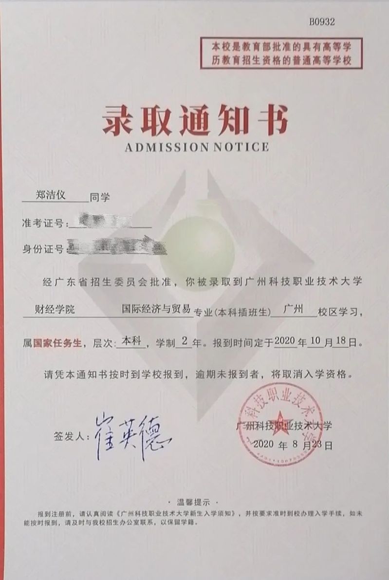 在今年的八月鄭潔儀同學(xué)收到了廣州科技職業(yè)技術(shù)大學(xué)的錄取通知書。