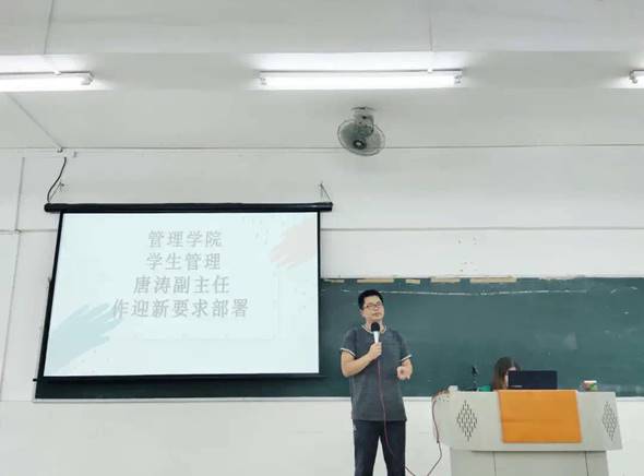 緊接著,由管理學(xué)院學(xué)生管理唐濤副主任對本次迎新工作做出要求:他希望全體迎新工作人員要以熱情的工作態(tài)度對待新生及家長,要充分體現(xiàn)管理學(xué)院對新生的人文關(guān)懷,并強調(diào)在疫情防控期間,各工作人員要做好個人防護,在保證個人以及新生安全情況下開展工作。