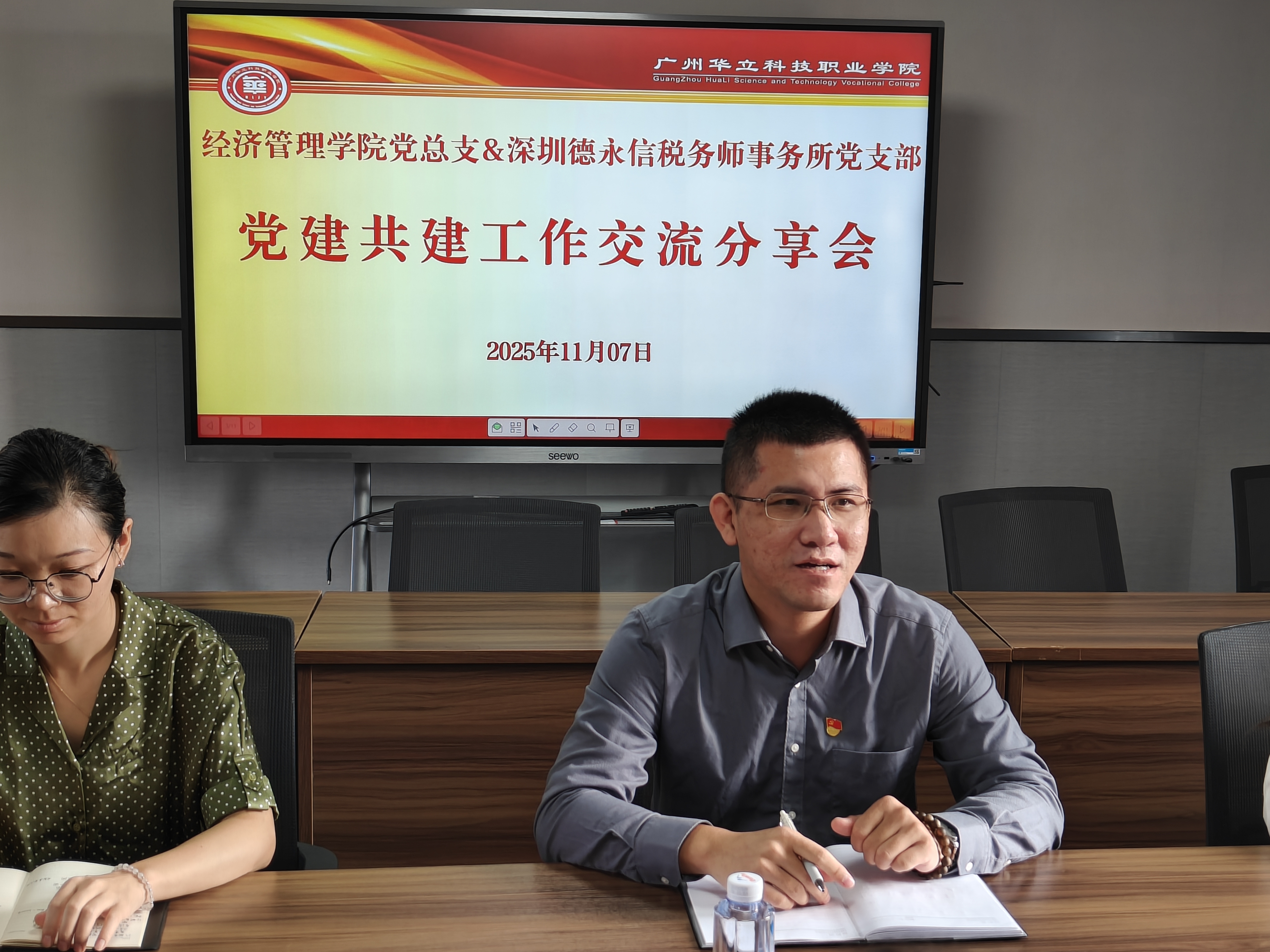2025年11月9日上午,經(jīng)濟(jì)管理學(xué)院黨總支與深圳德永信稅務(wù)師事務(wù)所黨支部在學(xué)院黨員活動(dòng)室聯(lián)合召開黨建共建研討會(huì)。深圳德永信稅務(wù)師事務(wù)所黨支部書記李小龍同志,經(jīng)濟(jì)管理學(xué)院黨總支書記、院長劉惠玲同志,黨委委員、副院長朱向平同志及雙方黨員代表出席會(huì)議。