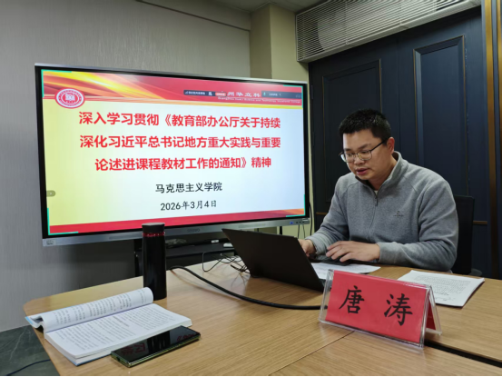 首先,馬克思主義學院院長助理、院黨支部組織員唐濤,傳達了《教育部辦公廳關(guān)于持續(xù)深化習近平總書記地方重大實踐與重要論述進課程教材工作的通知》精神。