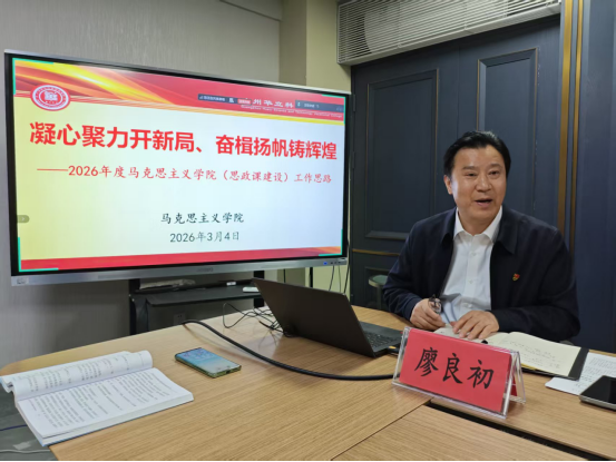 接著,馬克思主義學院院長廖良初教授,就2026年馬克思主義學院建設(shè)和發(fā)展談了自己的工作思路并作出了周密安排。他指出2026年是國家“十五五”規(guī)劃的開局之年,是學校迎接教育部辦學能力評價的關(guān)鍵之年,馬克思主義學院和全體思政課教師要用高標準、嚴要求抓好今年的各項工作。他從規(guī)范管理,營造積極向上的工作氛圍抓好行政人事工作;突出中心,建造粲然可觀的教學業(yè)績抓好教學教研工作;強化科研,創(chuàng)造特色鮮明的研究成果抓好科研社會服務(wù)工作;黨建引領(lǐng),打造廉潔高效的戰(zhàn)斗堡壘抓好黨務(wù)宣傳工作。廖院長的報告全面深刻,目標明確,思路清晰,措施得力。他希望全體同仁發(fā)揚龍馬精神,以飽滿的熱情和扎實的學風,深耕主責主業(yè),不斷提升馬克思主義學院的教學、科研、黨建、行政工作實力,不斷提升思政課的“到課率”“抬頭率”和“點頭率”,為培養(yǎng)擔當民族復興大任的時代新人貢獻“思政人”的智慧和力量。