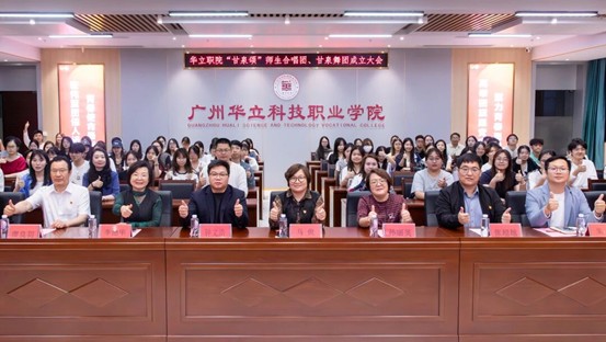 在全場見證下,廣州市甘泉文化研究會執(zhí)行會長、廣州華立科技職業(yè)學(xué)院常務(wù)副校長馬俊教授、廣州市甘泉文化研究會副會長、馬克思主義學(xué)院院長廖良初教授、廣州華立科技職業(yè)學(xué)院人事處處長鐘文浩、教務(wù)處處長孫麗英、校團委書記張超越、藝術(shù)與傳媒學(xué)院院長朱君共同為“甘泉頌”師生合唱團、甘泉舞團成立揭牌。