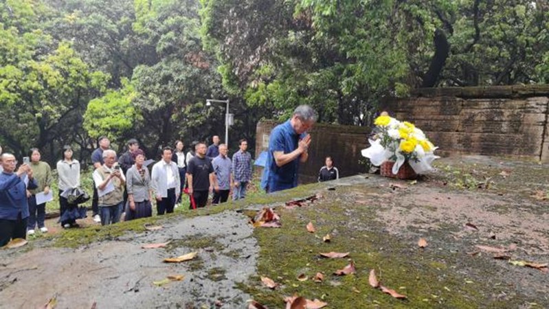 禮畢,全體與會(huì)人員靜默肅立。黃明喜會(huì)長(zhǎng)緩步至墓碑前,敬獻(xiàn)花籃,行鞠躬禮,深切緬懷甘泉先生的道德文章與教化功績(jī)。肅穆的氛圍中,眾人凝望碑石,思緒悠遠(yuǎn),仿佛與先賢隔空對(duì)話。