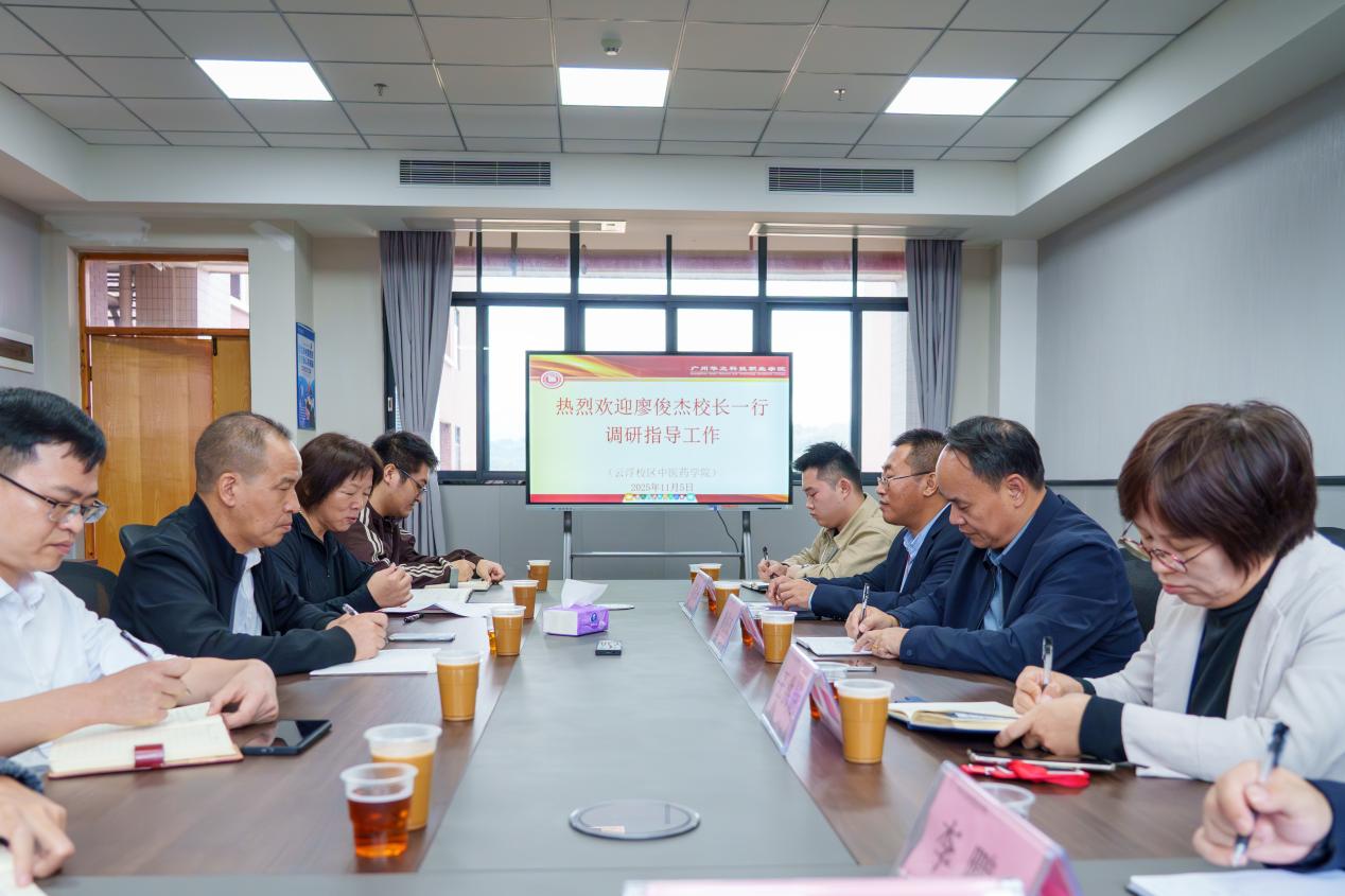為全面了解中醫(yī)藥學(xué)院云浮校區(qū)工作開展情況,精準(zhǔn)破解學(xué)院發(fā)展難題,推動(dòng)中醫(yī)學(xué)專業(yè)高質(zhì)量發(fā)展,2025年11月5日下午,校長廖俊杰率隊(duì)到我院云浮校區(qū)調(diào)研指導(dǎo)工作,副校長高堯來、副校長王洪艷、校長助理李鵬、人事處副處長邱志宏以及教務(wù)處副處長李濤陪同參加調(diào)研。