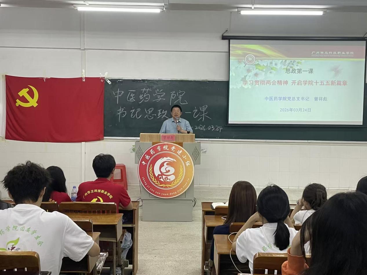 2026年3月24日,廣州華立科技職業(yè)學(xué)院中醫(yī)藥學(xué)院于圖書館401教室開展思政第一課專題學(xué)習(xí)活動(dòng)。本次課程由中醫(yī)藥學(xué)院黨總支書記曾祥彪主講,學(xué)院師生代表齊聚一堂,深入學(xué)習(xí)貫徹全國兩會(huì)精神,緊扣國家發(fā)展戰(zhàn)略,共同探討學(xué)院開啟“十五五”發(fā)展新篇章的實(shí)踐路徑,凝聚師生奮進(jìn)力量。