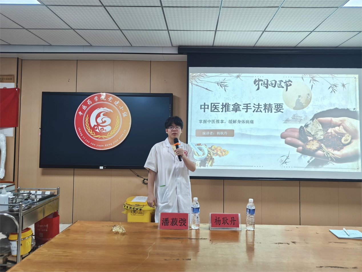 2026年4月16日晚,由中醫(yī)藥學(xué)院黨總支主辦,黨建小組與中醫(yī)藥應(yīng)用研究所聯(lián)合承辦的黨建引領(lǐng)“亦生亦師”項(xiàng)目化課程系列講座第九期,在西二教學(xué)樓104實(shí)訓(xùn)室圓滿舉辦。本期講座以中醫(yī)手法推拿精要為核心主題,特邀楊耿丹同學(xué)擔(dān)任主講,采用“理論精講+現(xiàn)場(chǎng)示范+分組實(shí)操”的沉浸式教學(xué)模式,帶領(lǐng)在場(chǎng)學(xué)子深度體悟中醫(yī)推拿的科學(xué)內(nèi)涵與實(shí)用價(jià)值。