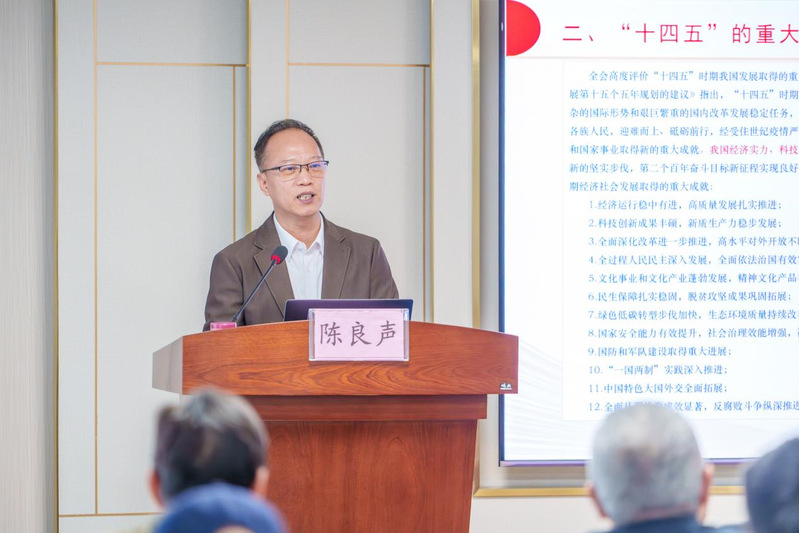 報告會上,陳良聲書記以“深入學(xué)習(xí)貫徹二十屆四中全會精神,全力推進華立職院高質(zhì)量發(fā)展”為題,圍繞學(xué)習(xí)貫徹習(xí)近平總書記在黨的二十屆四中全會上的重要講話精神和全會《建議》,介紹了黨的二十屆四中全會基本情況,用詳實數(shù)據(jù)和豐富內(nèi)容闡述了“十四五”時期我國經(jīng)濟實力、科技實力、綜合國力躍上新臺階,在科技、教育、人才、國防建設(shè)等方面取得歷史性重大成就,對“十五五”時期在基本實現(xiàn)社會主義現(xiàn)代化進程中的重要地位、“十五五”時期經(jīng)濟社會發(fā)展的指導(dǎo)思想、重大原則和主要目標(biāo),以及“十五五”時期的戰(zhàn)略任務(wù)和重大舉措等進行了全面系統(tǒng)、深入透徹的宣講解讀。