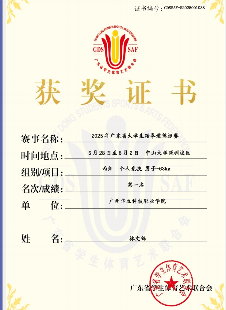 廣東省大學(xué)生跆拳道錦標(biāo)賽 男子(63kg)項(xiàng)目第一名